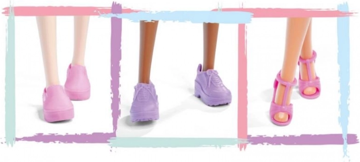 Roze en paarse sneakers of sandalen geven elke outfit extra flair en benadrukken de modieuze stijl van de pop.