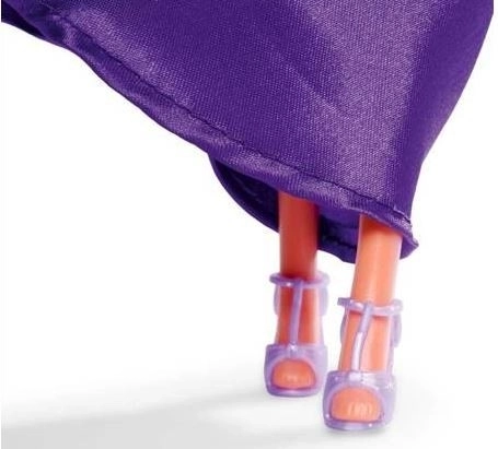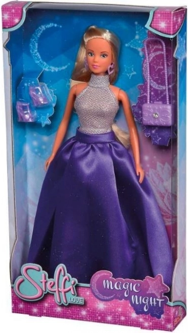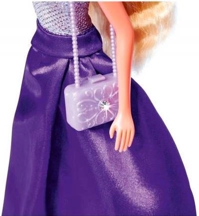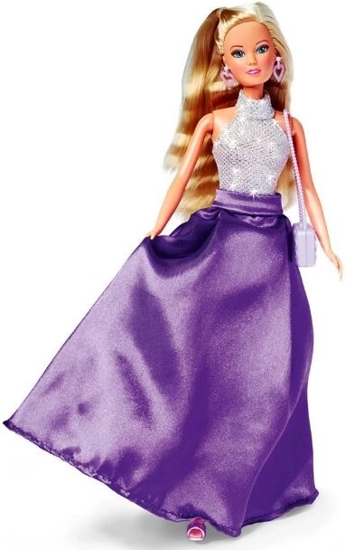 Pop Steffi in een glinsterende zilver‑paarse jurk betovert elke kleine styliste. Ze heeft lang blond haar, blauwe ogen en hartvormige oorbellen. Dankzij de bewegende armen, benen en het hoofd neemt ze makkelijk dynamische poses aan en inspireert ze tot het bedenken van eigen verhaaltjes. In de verpakking vind je ook paarse pumps en een bijpassende handtas.