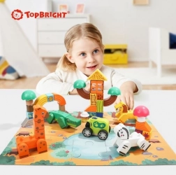 Safari Park voor kleine avonturiers! Kinderen kunnen hun eigen safaripark bouwen met houten blokken en een puzzel van TOP BRIGHT, en zich aansluiten bij de gids voor de dagelijkse rondleiding door het dierenpark.