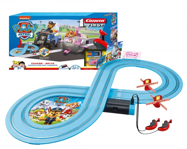 Ontdek de wereld van racen met de Carrera First Paw Patrol racebaan. Dankzij de overzichtelijke bediening en het robuuste design is deze racebaan perfect voor kleine racers. Twee gedetailleerde autootjes, Chase en Skye, blijven dankzij magneten en contactborstels uitstekend op de baan, terwijl de draaiende propellers voor spanning en plezier zorgen.