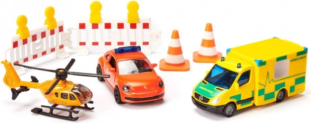 - Ambulance (bus), reddingspersonenauto, reddingshelikopter, 2× pylonen, 2× barrière