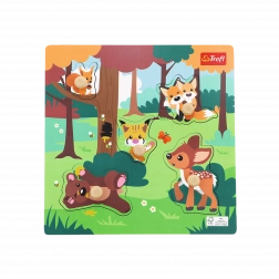 De houten inlegpuzzel met kleurrijke afbeeldingen van bosdieren is ontworpen om kinderen te vermaken en tegelijkertijd hun vaardigheden te ontwikkelen. Elk stukje is stevig, goed vast te pakken en voorzien van een houten knop voor gemakkelijk uitnemen. De onderplaat heeft uitgefreesde vormen met een zwart-wit afbeelding die overeenkomt met het stukje, wat kinderen helpt bij intuïtief toewijzen.