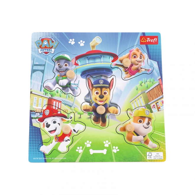 Houten mini-puzzel PAW Patrol met 5 stukjes en knopjes. Basisplaat met omtrekken voor makkelijker puzzelen. Vanaf 18 maanden, stimuleert fijne motoriek en vormherkenning.