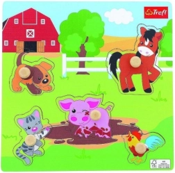 Deze houten mini-puzzel met boerderijmotief is ideaal voor kinderen vanaf 18 maanden. Dankzij de houten knopjes zijn de stukjes comfortabel vast te houden en eenvoudig te plaatsen. De onderplaat heeft uitgefreesde vormen met zwart-witte contouren, wat het kind helpt de vormen correct te matchen.