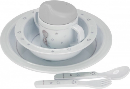 Deze set is ontworpen met het oog op kleine kinderen: het ontwerp is aangepast voor eenvoudig vasthouden en gebruiken. De antisliprubber op de bodem van bord, kom en beker helpt het servies stevig op zijn plek te houden tijdens het eten, wat zelfstandigheid aan tafel bevordert.