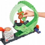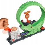 Beleef adrenaline met de Hot Wheels themaset, waar monsters de stad hebben overgenomen en spannende obstakels en stuntuitdagingen creëren. De pizzeria dient als lanceerder die het autootje de grote transparante looping in schiet en door de bek van de krokodil. In de doos zit 1 metalen autootje, dus het plezier kan meteen na het uitpakken beginnen.
