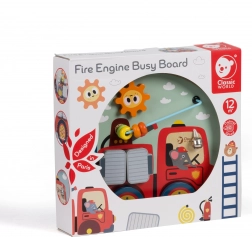 Het houten 6-in-1 manipulatielbord met brandweerthema van CLASSIC WORLD ontwikkelt kindvaardigheden vanaf 12 maanden. Het biedt opendeurtjes, een kralendoolhof, een draaibaar wiel, een ladder, een bel en een draaiknop. Gemaakt van hoogwaardig hout en geverfd met niet-giftige verf voor veilig leren door te spelen.