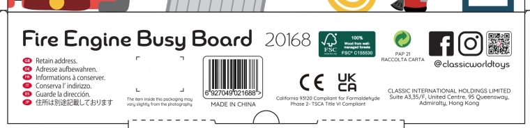 Ontdek een leuke en veilige manier om kindvaardigheden te ontwikkelen. Het houten 6-in-1 manipulatielbord CLASSIC WORLD met brandweer-motief ondersteunt de fijne motoriek, oog-handcoördinatie en creativiteit van kinderen vanaf 12 maanden. De hoogwaardige afwerking en niet-giftige verf garanderen duurzaamheid en veiligheid bij dagelijks spelen.