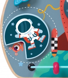 De raket met planeten en sterren wekt op natuurlijke wijze nieuwsgierigheid en nodigt kinderen uit om de afzonderlijke elementen te ontdekken – van het doolhof tot de draaiwielen.