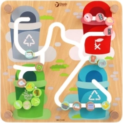 De andere kant heeft als thema recyclen, waar kinderen spelenderwijs de basis van afvalscheiding leren en voorwerpen aan de juiste containers koppelen. Dankzij het dubbelzijdige bord ontstaat op een natuurlijke manier een gesprek over natuurbescherming en het functioneren van de stad. De stevige houten uitvoering (30 × 30 cm) en de gladde, afgeronde randen zorgen voor veiligheid en een lange levensduur.