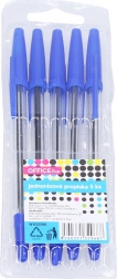 Praktische set met 5 wegwerpbalpennen met blauwe inkt, ideaal voor school, kantoor en dagelijks gebruik. Licht en comfortabel om mee te schrijven, betrouwbaar voor snelle aantekeningen en langere teksten.