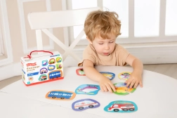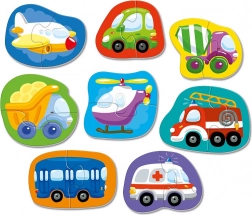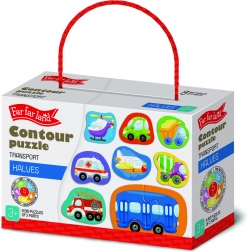 Ontdek de wereld van vervoersmiddelen met contourpuzzels die speciaal zijn ontworpen voor jonge kinderen. Elk van de 8 afbeeldingen bestaat uit slechts twee stevige stukjes, wat de eerste stappen in puzzelen vergemakkelijkt en het zelfvertrouwen van kleine spelers versterkt. Dankzij contrastrijke vormen en heldere illustraties begrijpen kinderen snel het principe van het combineren.