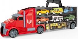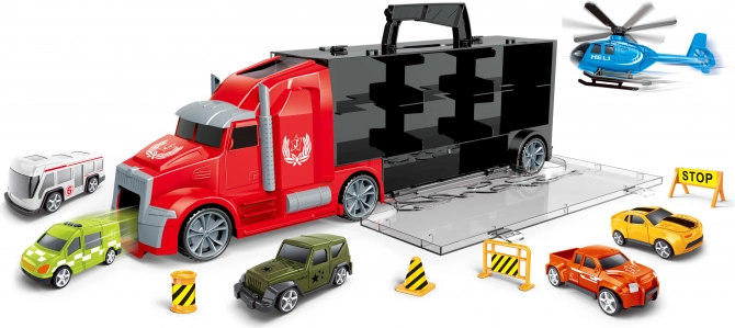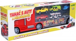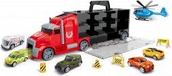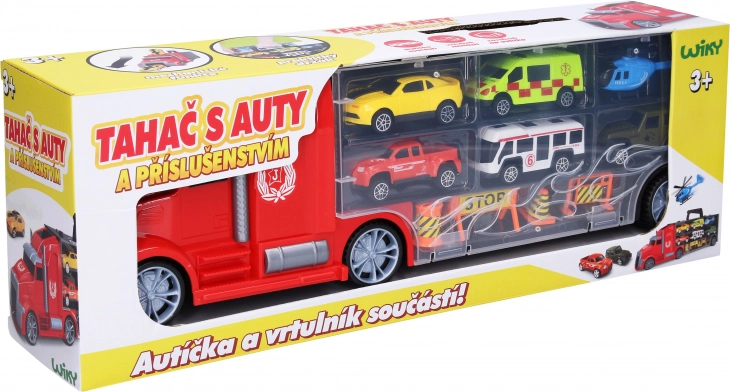 De set bevat 5 autootjes en 1 helikopter, zodat de pret meteen na het uitpakken kan beginnen. De praktische uittrekbare handgreep aan de bovenzijde van de aanhanger maakt dragen eenvoudig. Geleverd met Tsjechischtalige verpakking.