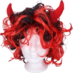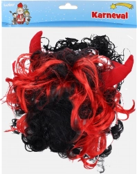Stijlvolle carnavalspruik met rode horens en opvallend rood haar, waarin ook zwarte lokken doorschijnen. Ideaal voor kinderkostuums en volwassen kostuums van een duivel. Opvallende look, makkelijk op te zetten en geweldig accessoire voor Sinterklaas, carnaval en feestjes. Geschikt vanaf 6 jaar.