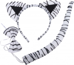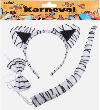 Een schattige carnavalsset in het design van een witte tijger tovert ieder kind in een oogwenk om. Bevat een haarband met oortjes, staart en vlinderdas – de ideale accessoire voor een maskerbal, kinderfeestjes en schooloptredens. Geschikt voor kinderen vanaf 3 jaar.