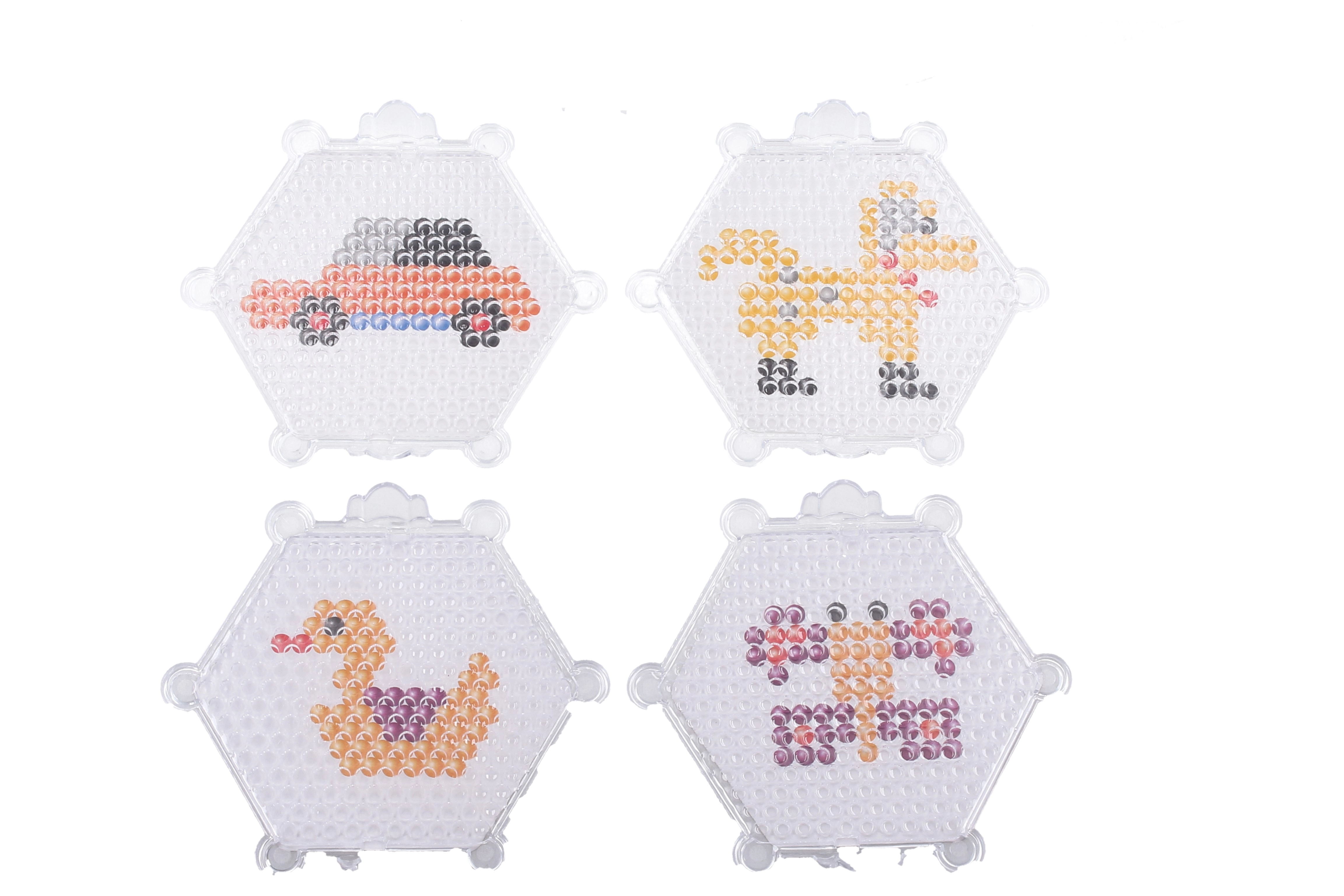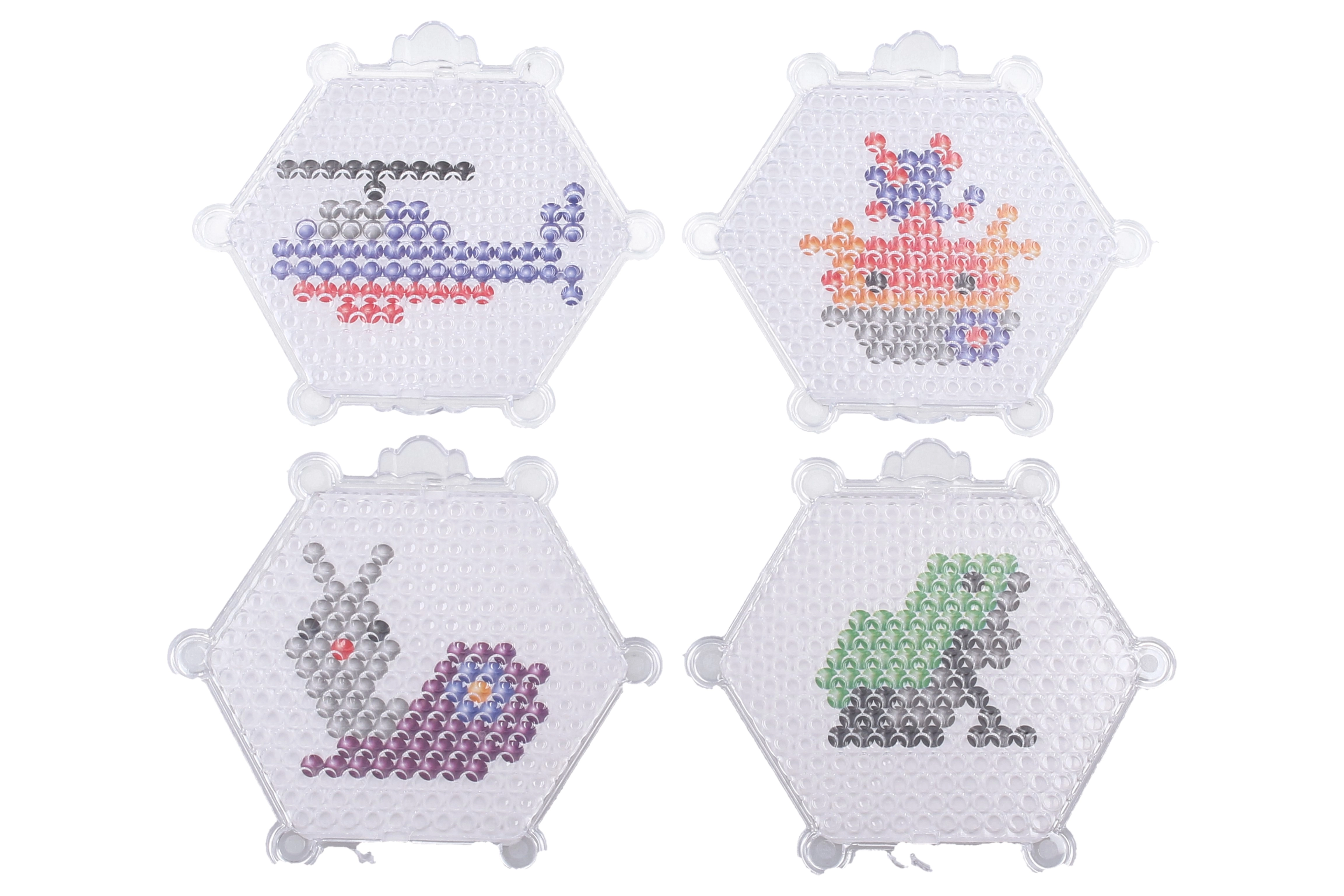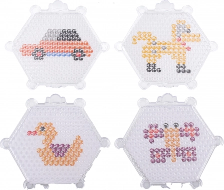 Hexagonale onderplaten met pinnetjes houden de kralen op hun plek en helpen bij het maken van gedetailleerde motieven zoals een auto, hondje, eendje of vlinder.