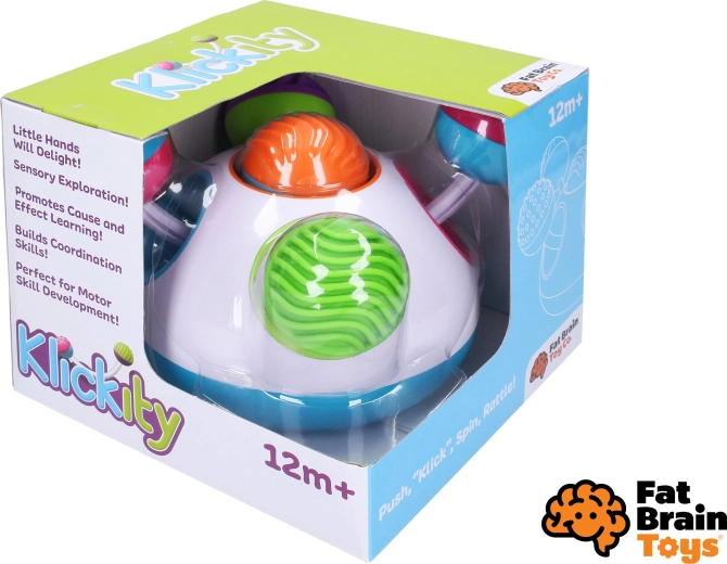 Fat Brain Klickity is een slimme motorische speelset die natuurlijke kinderlijke nieuwsgierigheid prikkelt. De combinatie van contrasterende kleuren, prettige texturen en eenvoudige mechanische functies (duwen, naar buiten laten poppen, draaien) zorgt voor lange minuten gefocust spel en vaardigheidsontwikkeling.