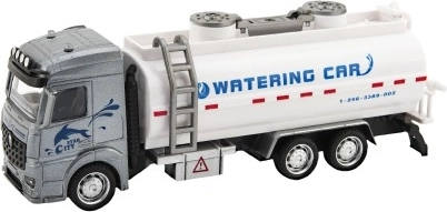 Model van een waterwagen met grijze cabine en witte tank, dat de mogelijkheid biedt voor thematisch spel met waterelementen.