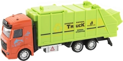 Deze vuilniswagen met oranje cabine en groen lichaam brengt elementen van stadsbeheer in het spel.