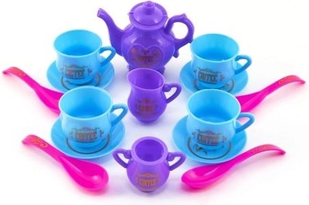 Elk klein meisje heeft servies nodig in haar kinderkokentje om thee en koffie te kunnen maken voor haar vriendinnetjes en knuffels. De set bevat 4 kopjes met schoteltjes, lepeltjes, een kan voor koffie of thee met deksel, een kleiner kannetje voor room en een suikerpotje.