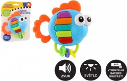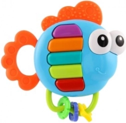 Vrolijke muzikale rammelaar en bijtring in de vorm van een visje voor de allerkleinsten vanaf 3 maanden. Bij het indrukken van de toetsen hoor je melodieën en losse tonen, terwijl de toetsen oplichten. Gemaakt van kunststof voor eenvoudige reiniging, met batterijen inbegrepen en een veiligheidsslot.