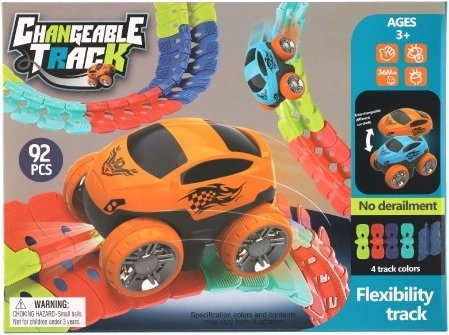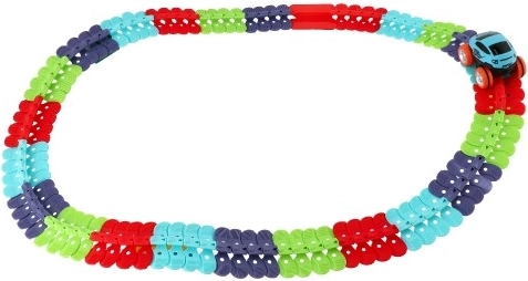 De racebaan bestaat uit gekleurde, verbindbare delen die het mogelijk maken de baan te buigen in verschillende vormen.
