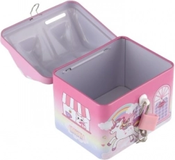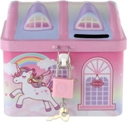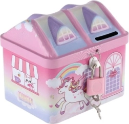 De speelse en kleurrijke spaarpot in de vorm van een huisje is een geweldig cadeau voor kinderen die hun spaargeld veilig willen bewaren. Dit blikken huisje met eenhoorn en regenboog motief beschermt niet alleen hun schatten, maar siert ook de kinderkamer.