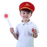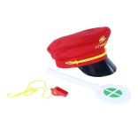 Deze leuke conducteursset is geweldig voor alle kleine en grotere treinliefhebbers. Kinderen kruipen gemakkelijk in de rol, zetten de stijlvolle rode pet met borduursel op, blazen op de fluit en heffen het vertrekbord – en de trein kan vertrekken! Perfect voor de ontwikkeling van fantasie, sociale vaardigheden en rollenspellen.