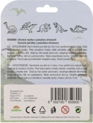 Vijf houten stempels met dinosaurusmotieven en een inktkussen in de verpakking – gewoon openen en stempelen.