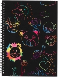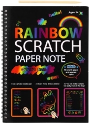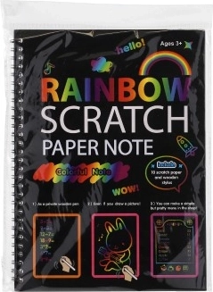 Dit krasnotitieboek met regenboogachtergrond biedt een eenvoudige maar fascinerende manier om originele tekeningen te maken. Op het zwarte oppervlak hoef je alleen maar zachtjes te krassen en meteen verschijnen heldere regenboogkleuren. Uitstekend voor kleine kunstenaars en ook als ontspannende bezigheid voor oudere kinderen.