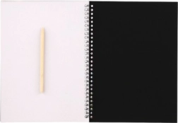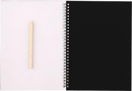 Het notitieboek heeft een formaat van ca. 19 × 26 cm en is spiraalgebonden voor comfortabel bladeren. In de verpakking vind je 10 bladen en een houten krasstokje, zodat je direct na het uitpakken kunt beginnen met creëren.