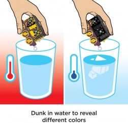 Dompel de locomotief in warm of koud water en zie de kleuren direct veranderen. Het effect is steeds opnieuw te herhalen en verveelt nooit.