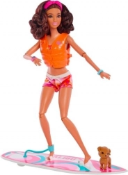 De Barbie-pop is klaar voor eindeloos veel strandspel. Ze draagt een sportieve zwemoutfit met een opvallende haarband en de stijlvolle clip op haar surfplank houdt haar stevig op haar plaats. Het kleine hondje is klaar om mee te gaan en plezier te maken.