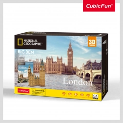 Iconische Big Ben als realistische 3D-puzzel NATIONAL GEOGRAPHIC van CUBICFUN. De onderdelen van stevig 3 mm foam met gelamineerde bedrukking zet je in elkaar zonder lijm en schaar. Indicatieve bouwtijd 120–220 minuten, afmetingen van het voltooide model 25,7 × 20,9 × 49,2 cm. Inclusief reisgids voor Londen (EN). 94 stukjes zorgen voor veel plezier en een elegante decoratie.