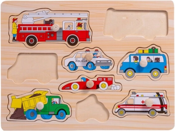 Ontdek de leuke houten inlegpuzzel met knopjes met het thema voertuigen, die kinderen helpt hun fijne motoriek, cognitieve vaardigheden en herkenning van vormen en kleuren te ontwikkelen. Negen stevige stukjes met comfortabele houten knopjes zijn gemakkelijk vast te pakken en op de juiste plek te plaatsen – ideaal voor kleine liefhebbers van auto’s, treinen en andere machines.