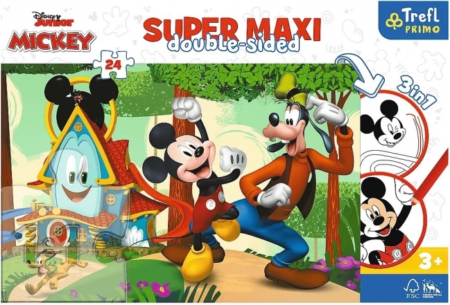 Puzzle Super Maxi 24 Vrolijk huis en vrienden brengt kinderen een combinatie van creativiteit, logica en plezier in het eigen resultaat. De voorkant biedt een kleurrijke illustratie met MICKEY en zijn vrienden, de achterkant verrast met een kleurplaat en een slim spel met kleurelementen – dubbel zoveel plezier in één product.