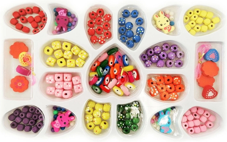 Met de set kun je interessante sieraden maken – rijg gewoon de kralen en knoop de uiteinden vast. De set biedt onbeperkte mogelijkheden om je eigen patronen te ontwerpen.