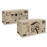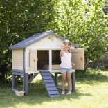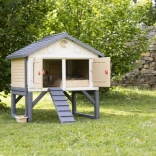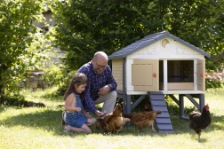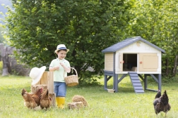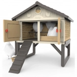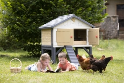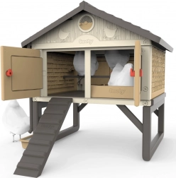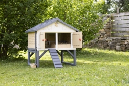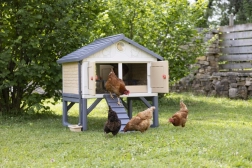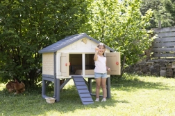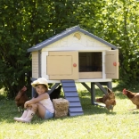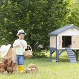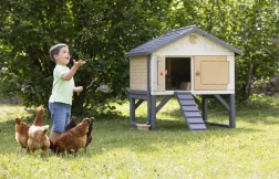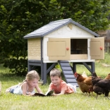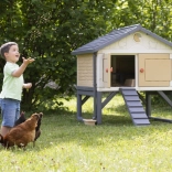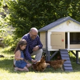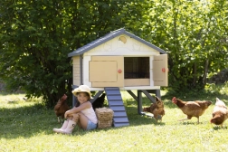 Echt kippenhok voor 3 tot 5 kippen. Kunststof, gemakkelijk schoon te maken en ruim kippenhok voor een kippenfamilie. De kippen bereiken het hok via een ladder. In het zitgedeelte is ook een nestkast. Het kippenhok is uitgerust met 4 grote deurtjes die ’s nachts kunnen worden gesloten. De speciale dakconstructie en goten maken het mogelijk regenwater op te vangen, dat in een container kan worden verzameld en gebruikt om de kippen te laten drinken. Het ventilatiesysteem maakt het mogelijk de toevoer van frisse lucht te verminderen of te verhogen, zelfs wanneer de deuren gesloten zijn. Bij de set zit een kinderbrochure: Hoe zorg je voor kippen + een nep-ei.