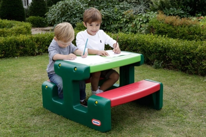 Praktische kinderpicknicktafel LITTLE TIKES in een combinatie van groen en rood biedt een stabiel oppervlak om te spelen en te eten, plus comfortabele geïntegreerde bankjes. Hij is weerbestendig, makkelijk schoon te maken en dankzij de afgeronde randen veilig voor kinderen. Aan de tafel kunnen comfortabel tot vier kinderen tegelijk spelen of een snack eten.