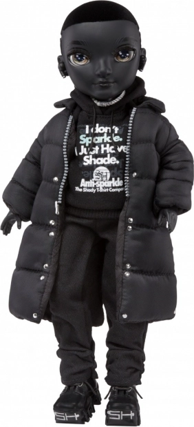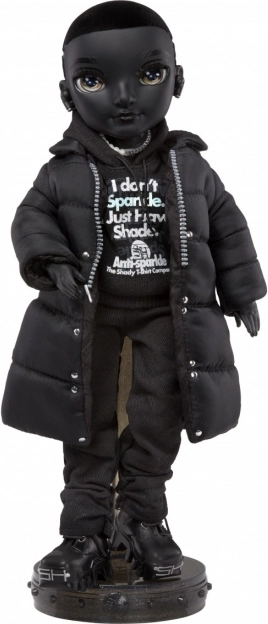 De pop draagt een stijlvolle zwarte outfit met een moderne en stedelijke uitstraling, inclusief een lange zwarte jas en accessoires.