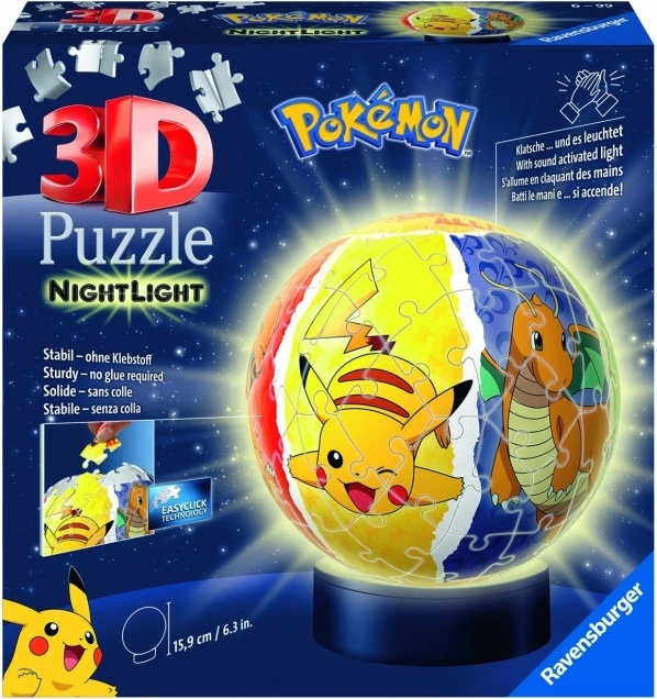 Ontdek plezier en decoratie in één – de 3D-puzzel lichtgevende bol POKÉMON van Ravensburger bestaat uit 72 stevige kunststof stukjes die precies in elkaar passen zonder lijm. Na het leggen ontstaat een stabiele 3D-bol met LED-achtergrondverlichting, die kan dienen als nachtlampje. Dankzij de genummerde stukjes is het leggen eenvoudig en leuk, ook voor kinderen vanaf 6 jaar.