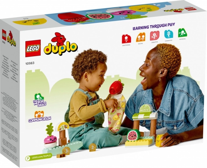 Lego Duplo Bio Boerenmarkt is een perfecte educatieve speelgoedset boordevol plezier. De set bevat een watermeloen, een citroen, een radijs en een aardbei, allemaal met verschillende gezichtsuitdrukkingen, een weegschaal, drie munten en een stoffen zak.