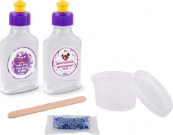PVA-lijm, activator, glitter, roerstaafje en afsluitbaar bekertje – direct klaar om glinsterend slijm te maken.