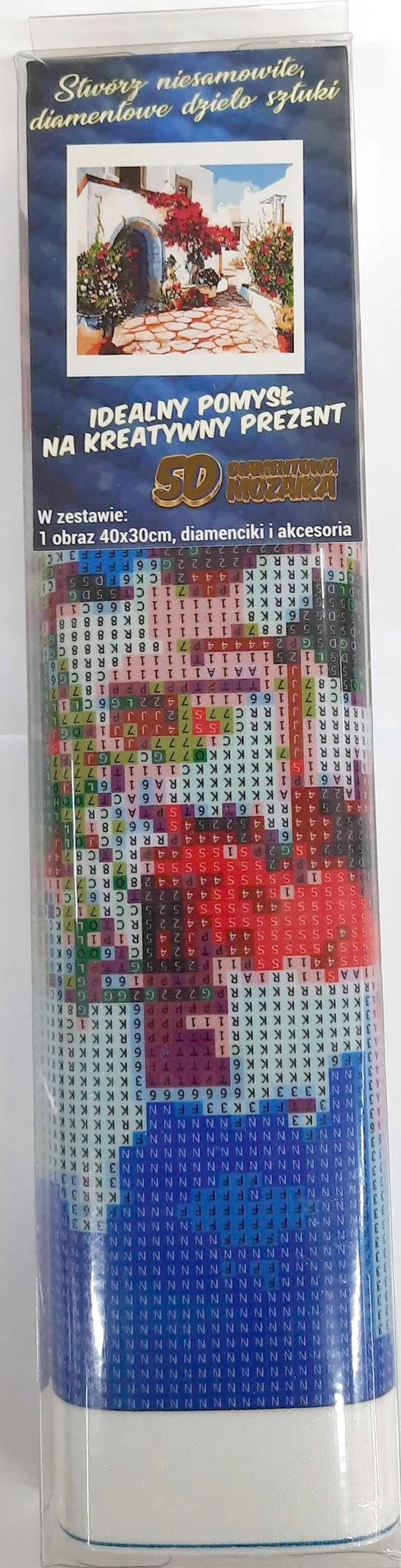 Diamantschilderen – werkwijze: Het canvas heeft een kleeflaag die is bedekt met folie, die je geleidelijk verwijdert. Trek de folie per gedeelte weg naargelang je de steentjes aanbrengt, om vervuiling van de kleeflaag te voorkomen. Breng de steentjes aan volgens de symbolen op het canvas, die overeenkomen met de meegeleverde legenda.