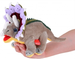 Deze pluchen dinosaurus is een getrouwe replica van de Triceratops met kenmerkende hoorns en opvallende blauwe ogen.