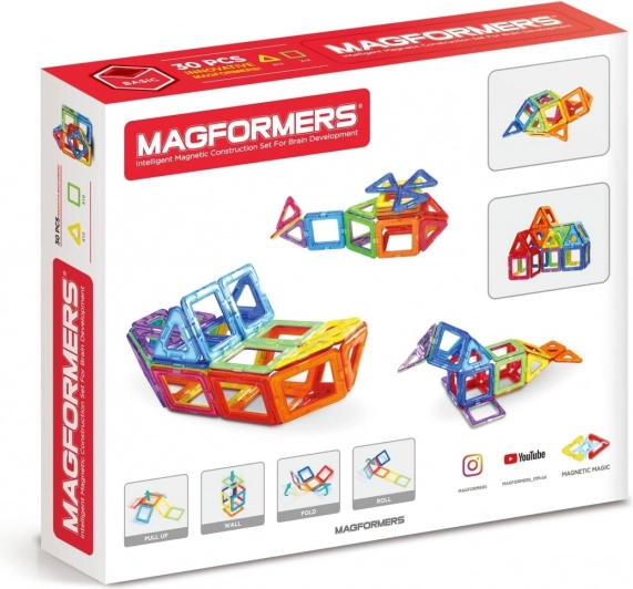 Magformers Basic 30 zijn blokken met ingebouwde krachtige neodymiummagneten die elkaar altijd aantrekken. Breng twee blokken met hun zijden dicht bij elkaar en ze klikken direct vast. Dankzij de blokken in geometrische vormen kun je prachtige driedimensionale constructies bouwen. Je kunt spelen met de meegeleverde handleiding, extra voorbeelden op magformersworld.com, of je eigen fantasie. De set bevat: 12 driehoeken; 18 vierkanten.