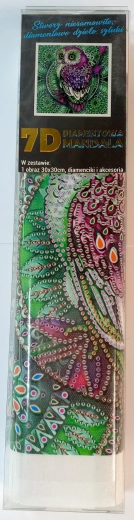 Ontdek ontspanning met de creatieve set voor 7D diamond painting met het motief uil op een groene mandala in het formaat 30 × 30 cm. Dankzij de verschillende vormen en groottes van de steentjes bereik je een diepte-effect en een schitterend resultaat. In de verpakking zit alles wat je nodig hebt voor een directe start – canvas, pen, steentjes, bakje en was.
