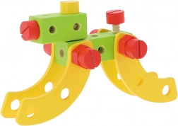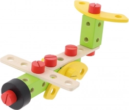 De set bevat 35 onderdelen: blokken, schroeven, gereedschap en een handleiding met voorstellen voor het bouwen van uiteenlopende constructies.