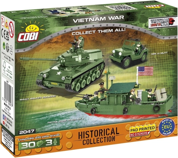 Bouw de sfeer van de Oorlog in Vietnam met drie gedetailleerde figuren. De Vietcong-soldaat heeft een typische uniform, een strohoed en het iconische AK-47-geweer. De Amerikaanse parachutist van de 101e Luchtlandingsdivisie draagt een armband met adelaar en is bewapend met een M16. Het derde figuur stelt de US Marines voor met een kogelwerend vest op het blote bovenlijf, een realistische helm met camouflage en een M16 met granaatwerper.