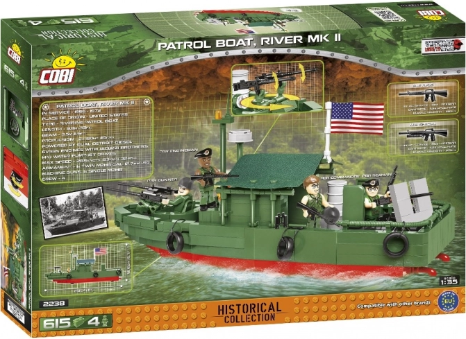 Bouw de iconische Amerikaanse patrouilleboot PBR (Patrol Boat, River) in schaal 1:35 uit 615 onderdelen. Zeer gedetailleerd model met een textielen luifel, functionele wieltjes voor soepel rijden over de vloer en een volledige bemanning van vier. Duurzame prints zonder stickers, compatibel met andere merken en veilig afgewerkt voor kinderen en verzamelaars.
